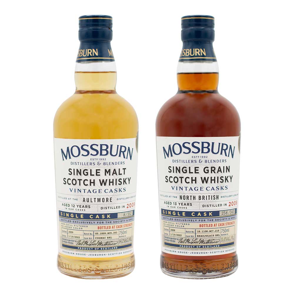 Bundle: Mossburn Single Cask – Aultmore Single Malt Scotch – Aged 12 Years – Cognac Barrel + Mossburn Single Cask – North British Single Grain Scotch – Aged 13 Years – Beaujolais Barrel (Bottled Exclusively for The Society & NWG)