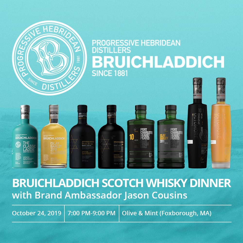Join us for an intimate evening tasting handcrafted scotch whiskies from the Bruichladdich distillery paired with cuisine from Olive & Mint in Foxborough, MA. Dinner will be hosted by Jason Cousins, Brand Ambassador for the Bruichladdich and Westland distilleries.