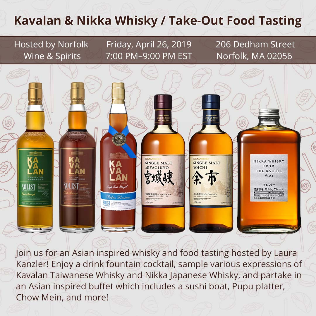 Join us for an Asian inspired whisky and food tasting hosted by Laura Kanzler! Enjoy a drink fountain cocktail, sample various expressions of Kavalan Taiwanese Whisky and Nikka Japanese Whisky, and partake in an Asian inspired buffet which includes a sushi boat, Pupu platter, Chow Mein, and more!