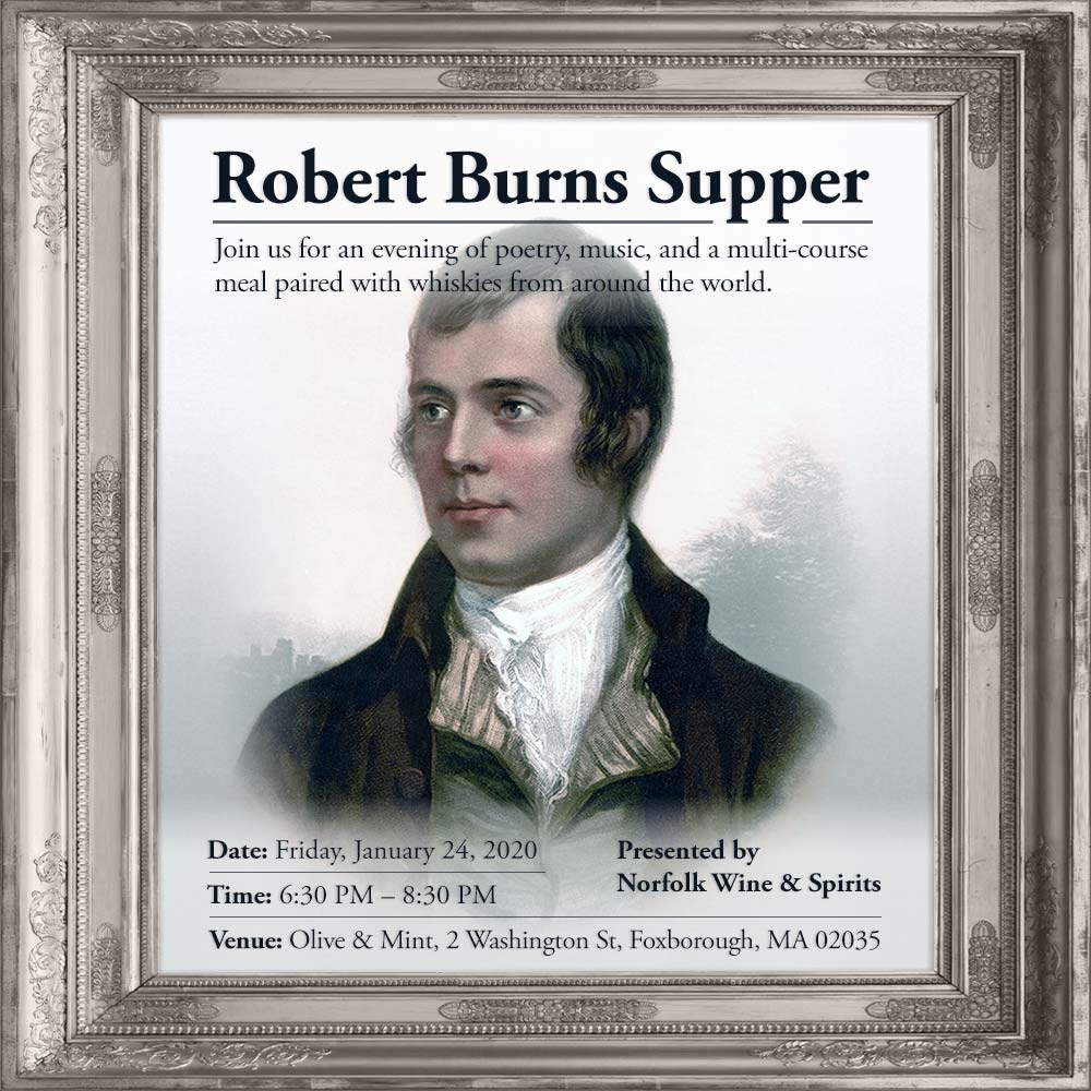 A Burns Supper is a celebration of the life and poetry of Robert Burns (January 25, 1759 – July 21, 1796), a popular Scottish poet. Suppers are typically held on or near his birthday and are known as Robert Burns Day, or more commonly, Burns Night. Join us at Olive & Mint in Foxborough, MA on January 24th for an evening of poetry, music, and a multi-course meal paired with whiskies from around the world.