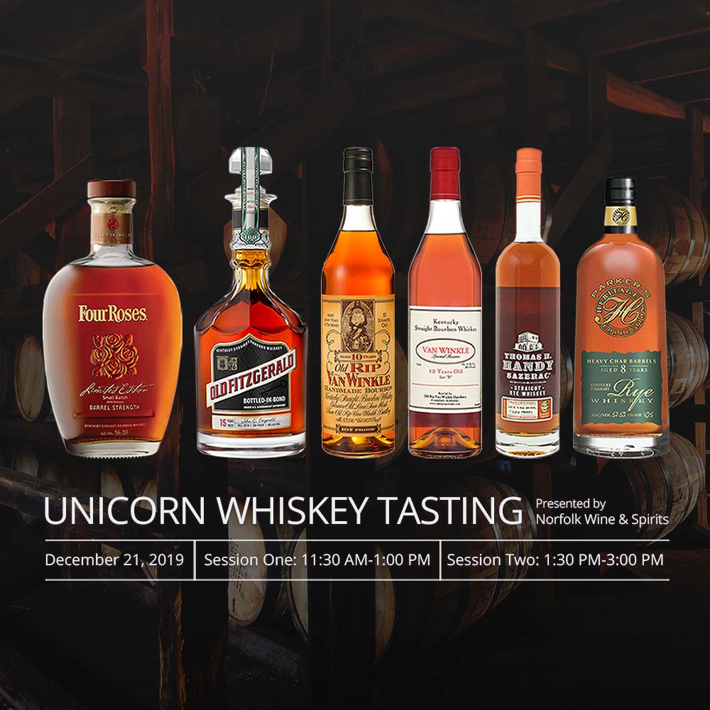 What is a unicorn whiskey? This term generally refers to rare and allocated whiskies that are highly sought after by enthusiasts and collectors. While many of these bottles are opened and consumed, many are also traded or sold for hundreds or even thousands of dollars over retail. Join us on December 21st at 11:30 AM (Session One) or 1:30 PM (Session Two) for a tasting that will provide patrons the opportunity to sample these hard to find whiskies.
