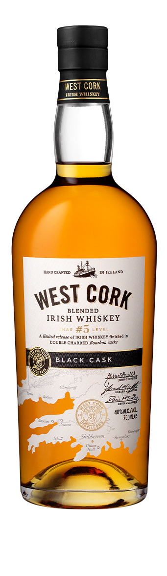 West Cork Black Cask Irish Whiskey is a meticulously crafted blend of 66% grain and 34% malt whiskey. Initially aged for three years in first-fill bourbon casks, it undergoes an additional year of “polish maturation” in heavily charred bourbon barrels. This innovative process imparts a beautifully balanced character to the whiskey, featuring a harmonious mix of vanilla, malt, and a lingering sweetness.